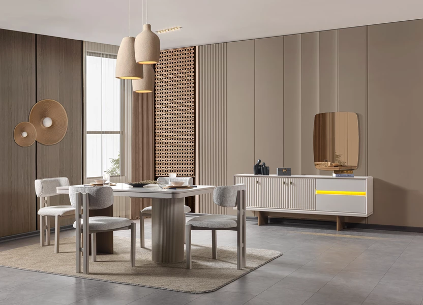 Takım içeriğinde 1 adet ADEN KONSOL, 1 adet ADEN KONSOL AYNASI, 1 adet ADEN AÇILIR MASA, 1 adet ADEN SANDALYE, 1 adet ADEN TV ÜNİTESİ ALT MODÜL, 1 adet ADEN TV ÜNİTESİ ÜST MODÜL bulunmaktadır.
